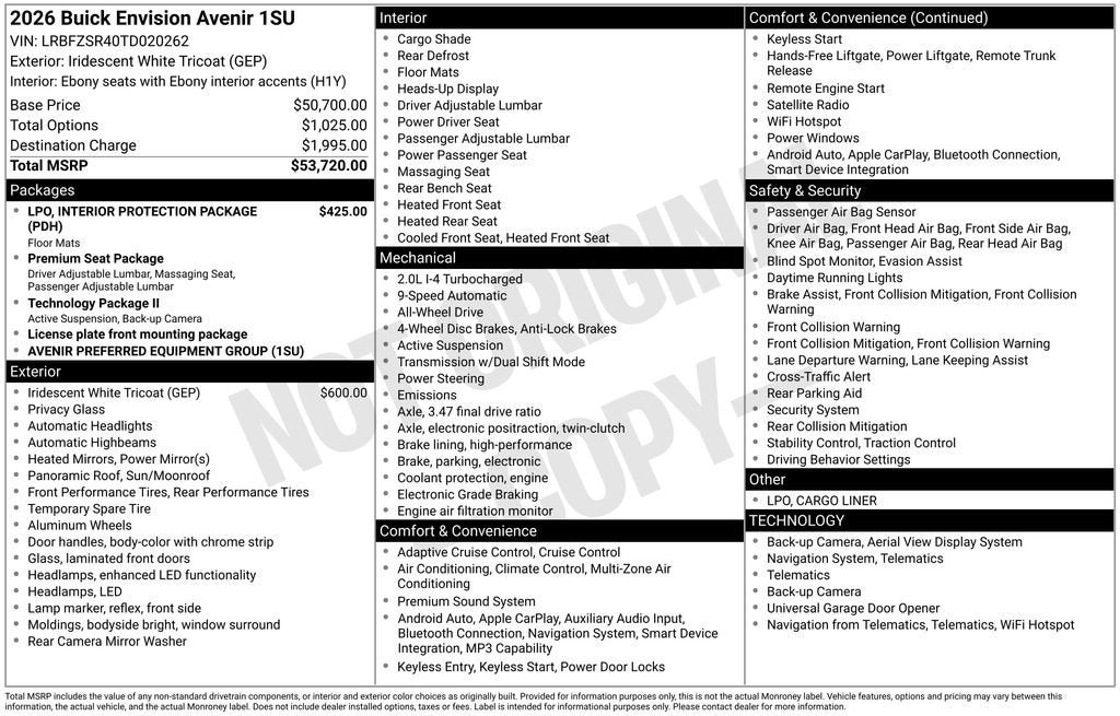 Iridescent White Tricoat 2026 Buick Envision Avenir AWD 9-Speed Automatic 2.0L Turbocharged Multi Point Service Inspection.