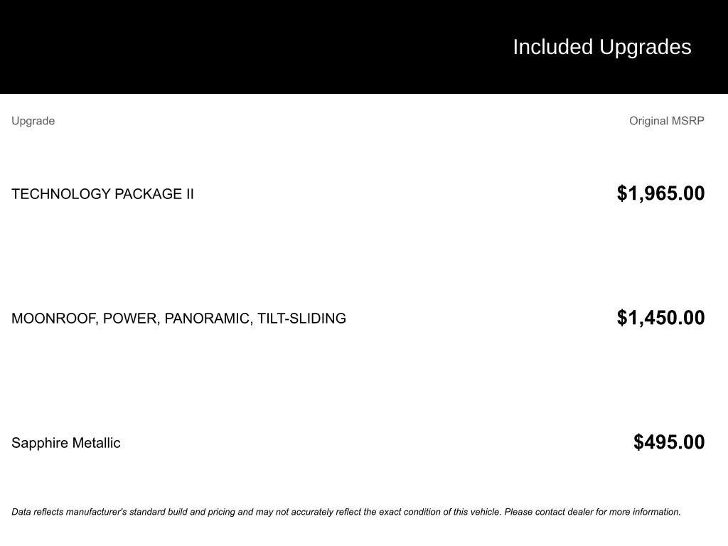 - TECHNOLOGY PACKAGE II: Enhanced Automatic Emergency Braking, Enhanced Automatic Parking Assist, Adaptive Cruise Control, LED headlamps, Rear Camera Mirror, Continuous Damping Control
