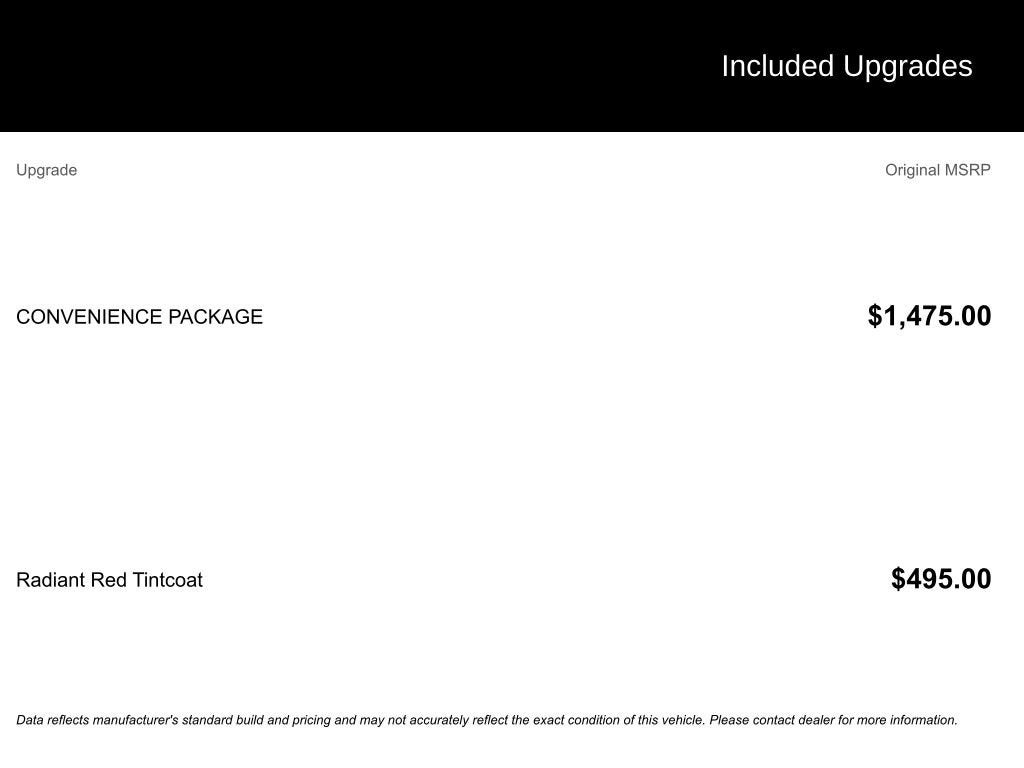 • Convenience Package: Includes Adaptive Cruise Control, Heated Front Seats, Universal Home Remote, Wireless Charging, Power Programmable Liftgate, Black Roof-Mounted Side Rails, Enhanced Automatic Emergency Braking, and Auto-Dimming Rearview Mirror